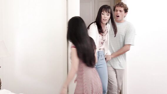 Мачеха случайно спалила за ласками сводных брата с сестрой. Отвела обоих в душе, но заметила у пасынка крепкий стояк. Начала сосать и не возражала, что падчерица поможет снять напряжение.