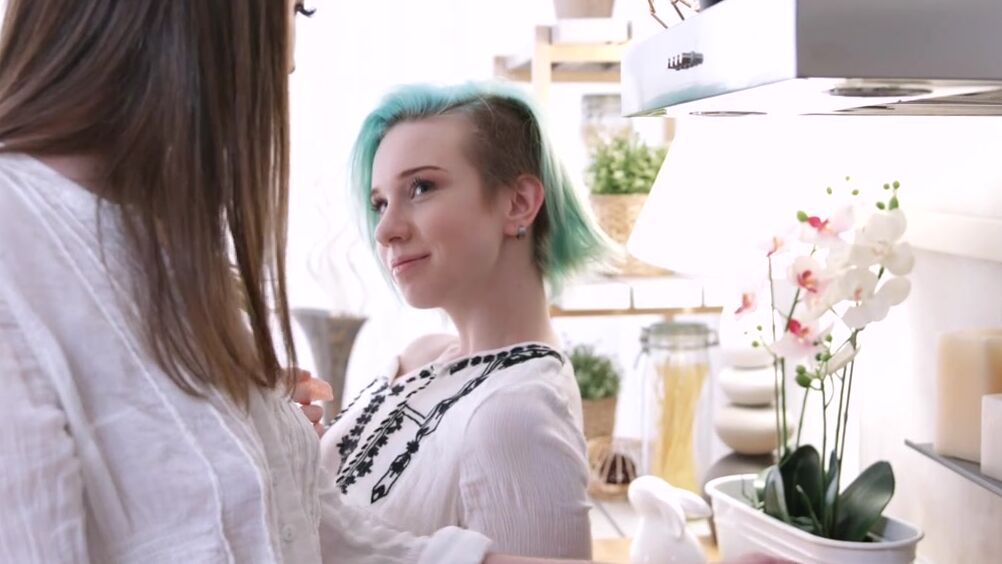 Брюнетка и её лесби подруга с голубыми волосами пришли на кухню за утренним кофе, но вместо бодрящего напитка получили групповой жмж секс с присоединившимся к ним парнем, жаждущим ласк.